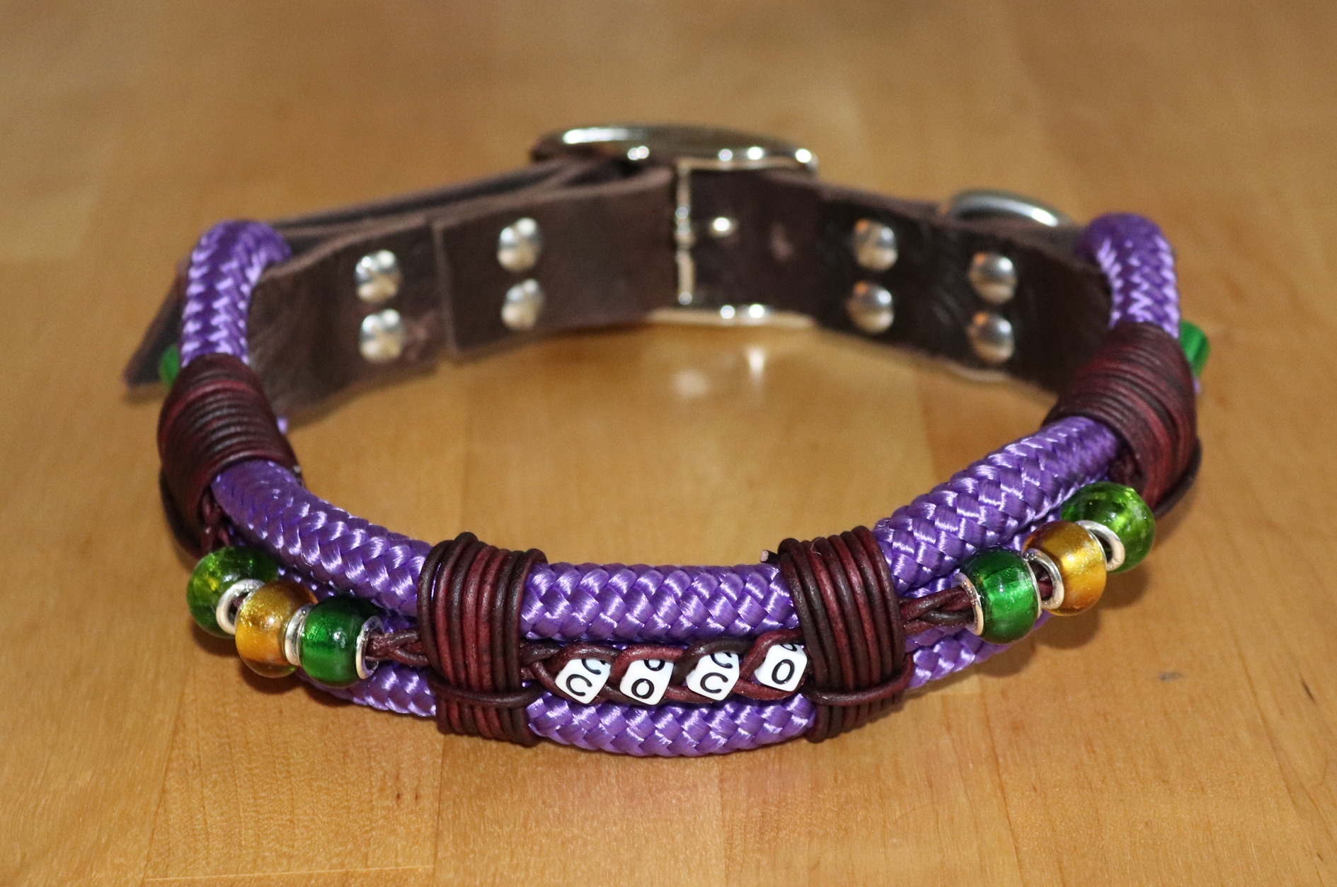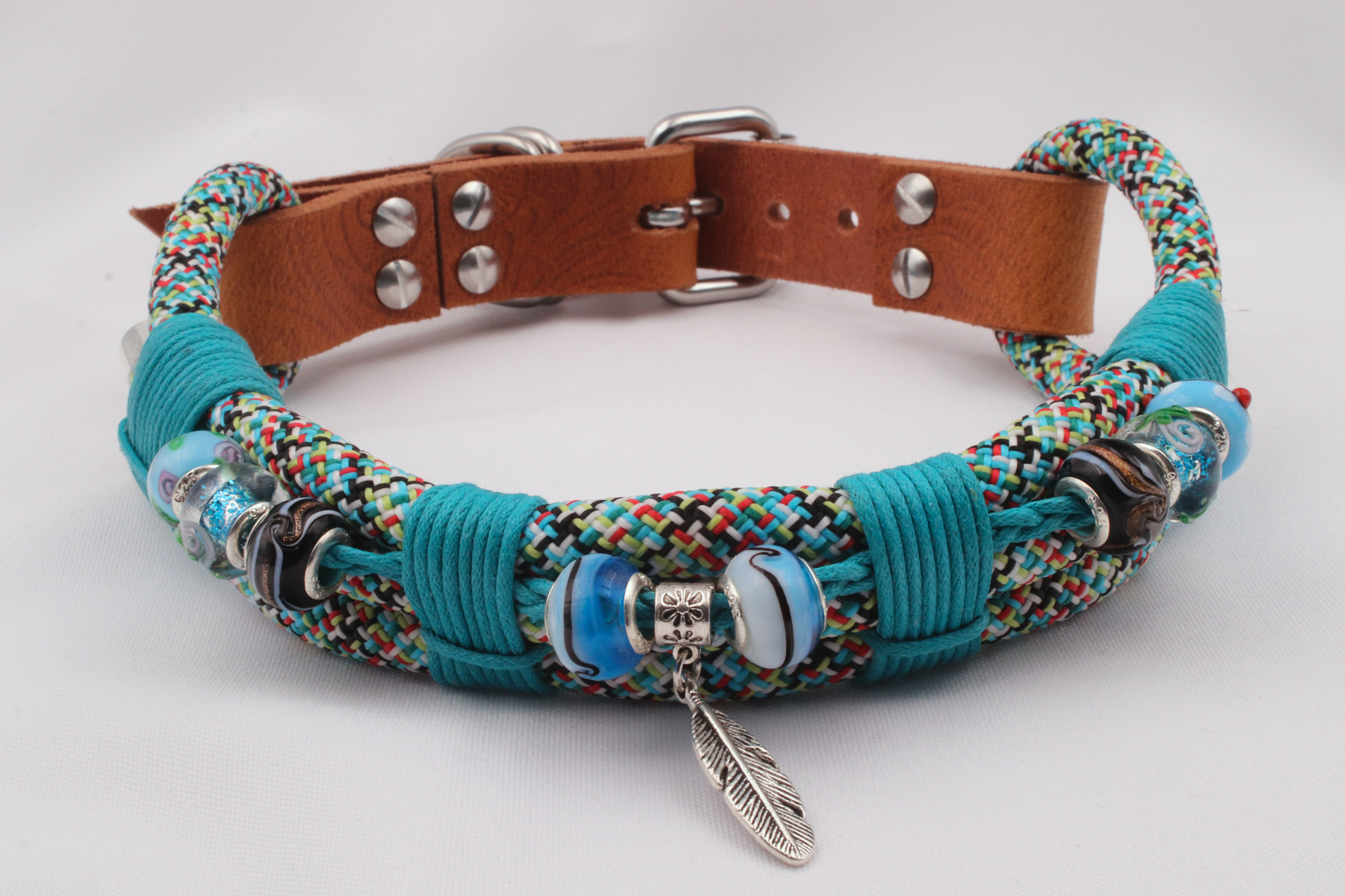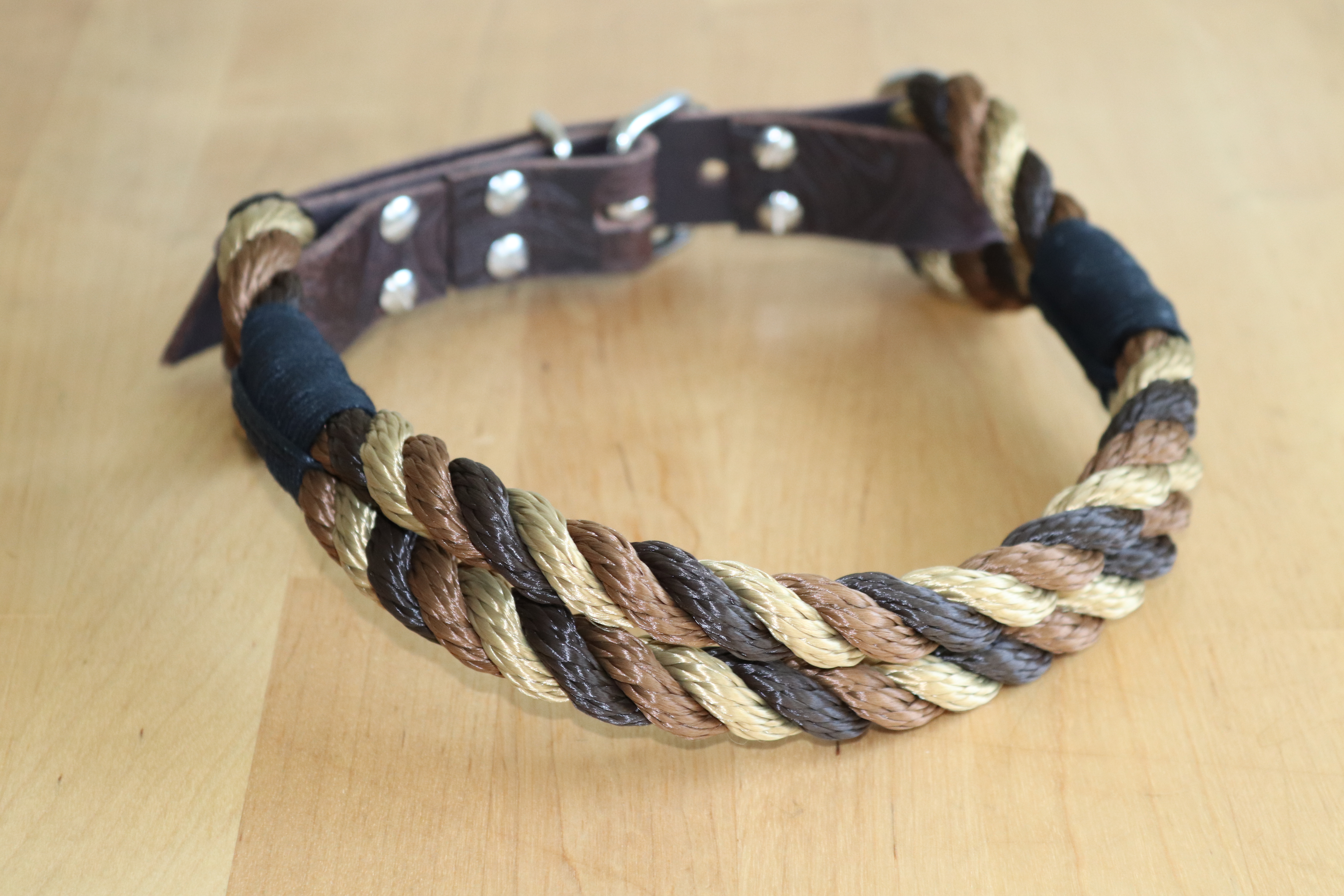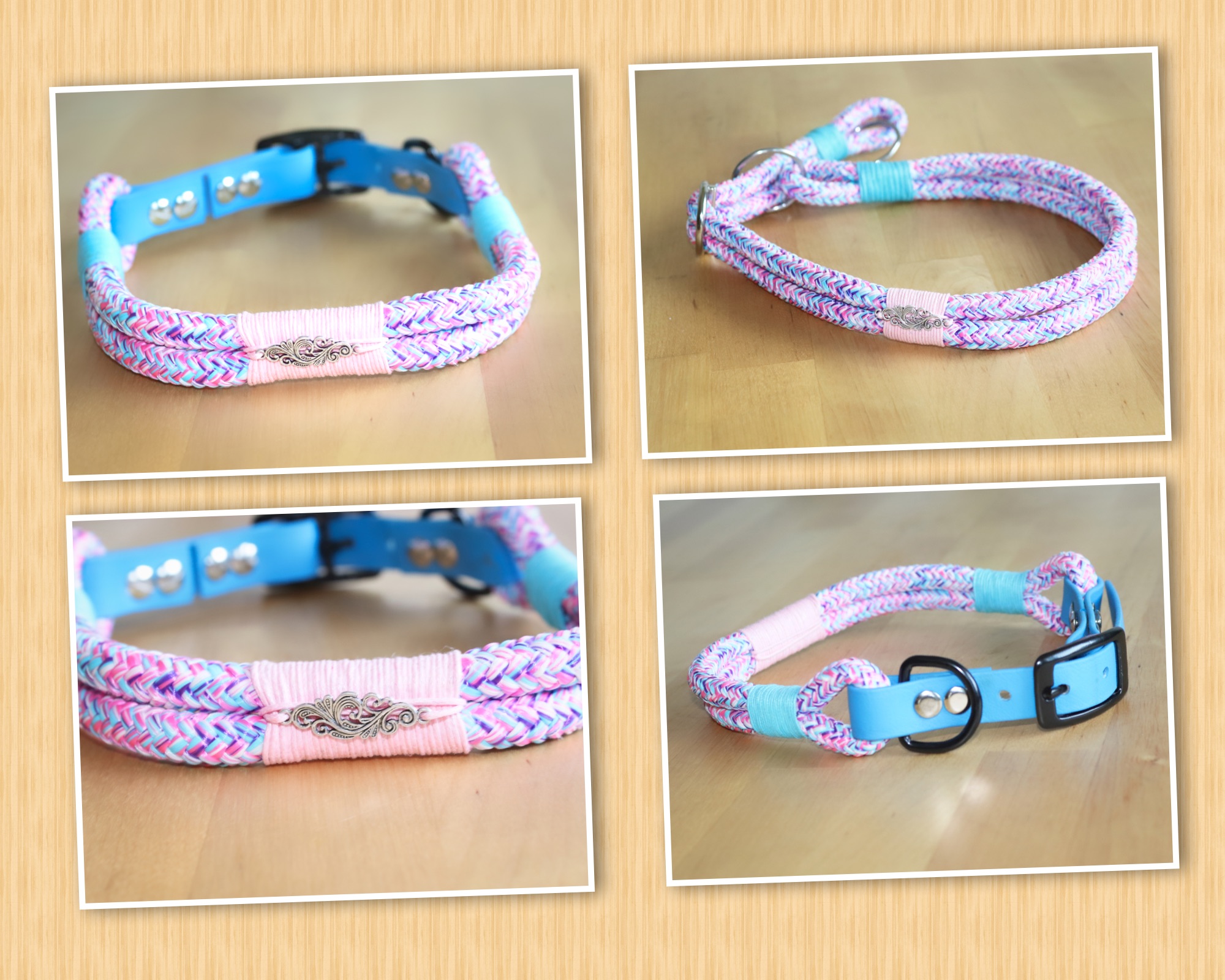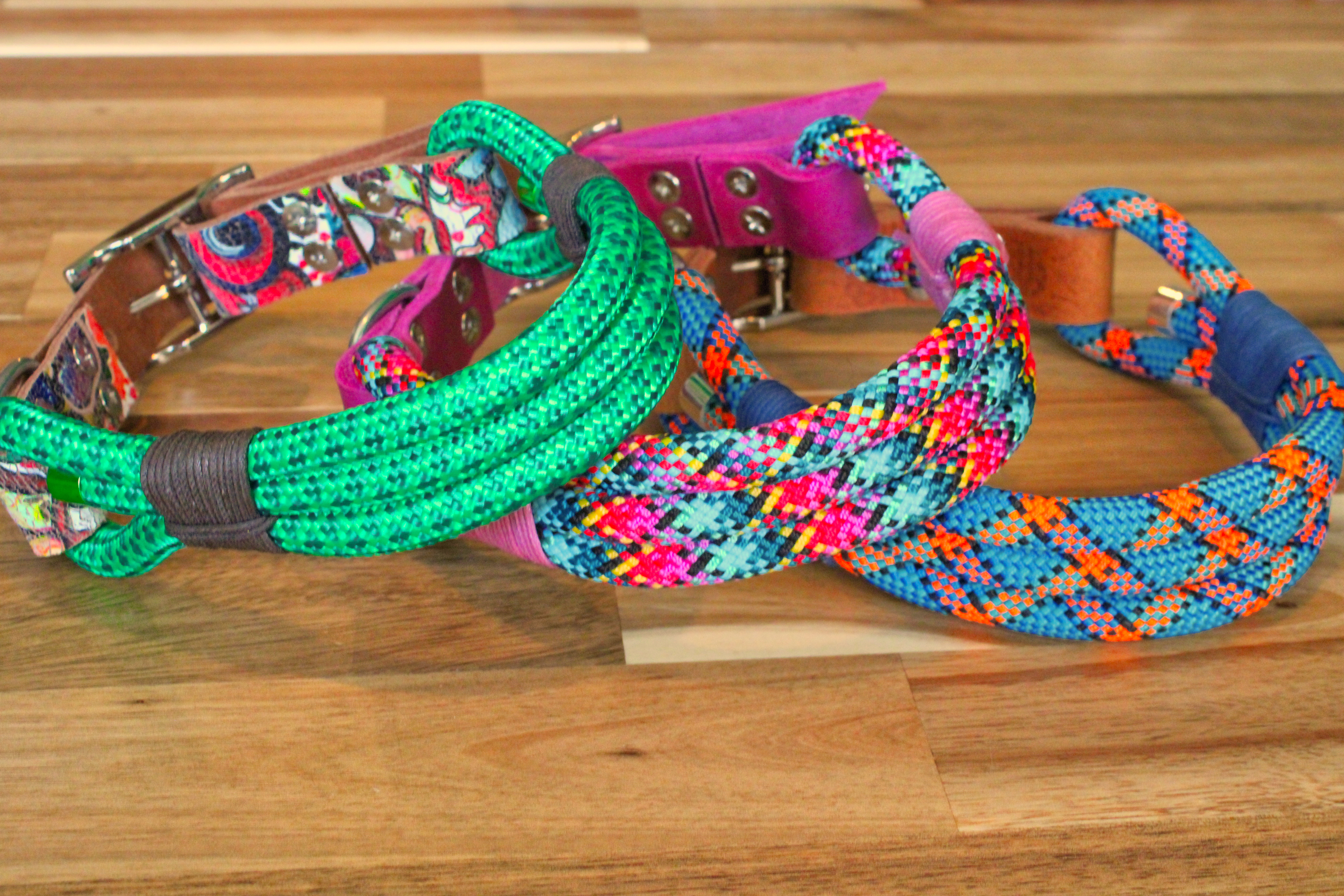 Zwei- oder dreireihige Halsbänder aus PPM Seil mit Leder- oder Biothane Verschluss. Eine kleine Auswahl.