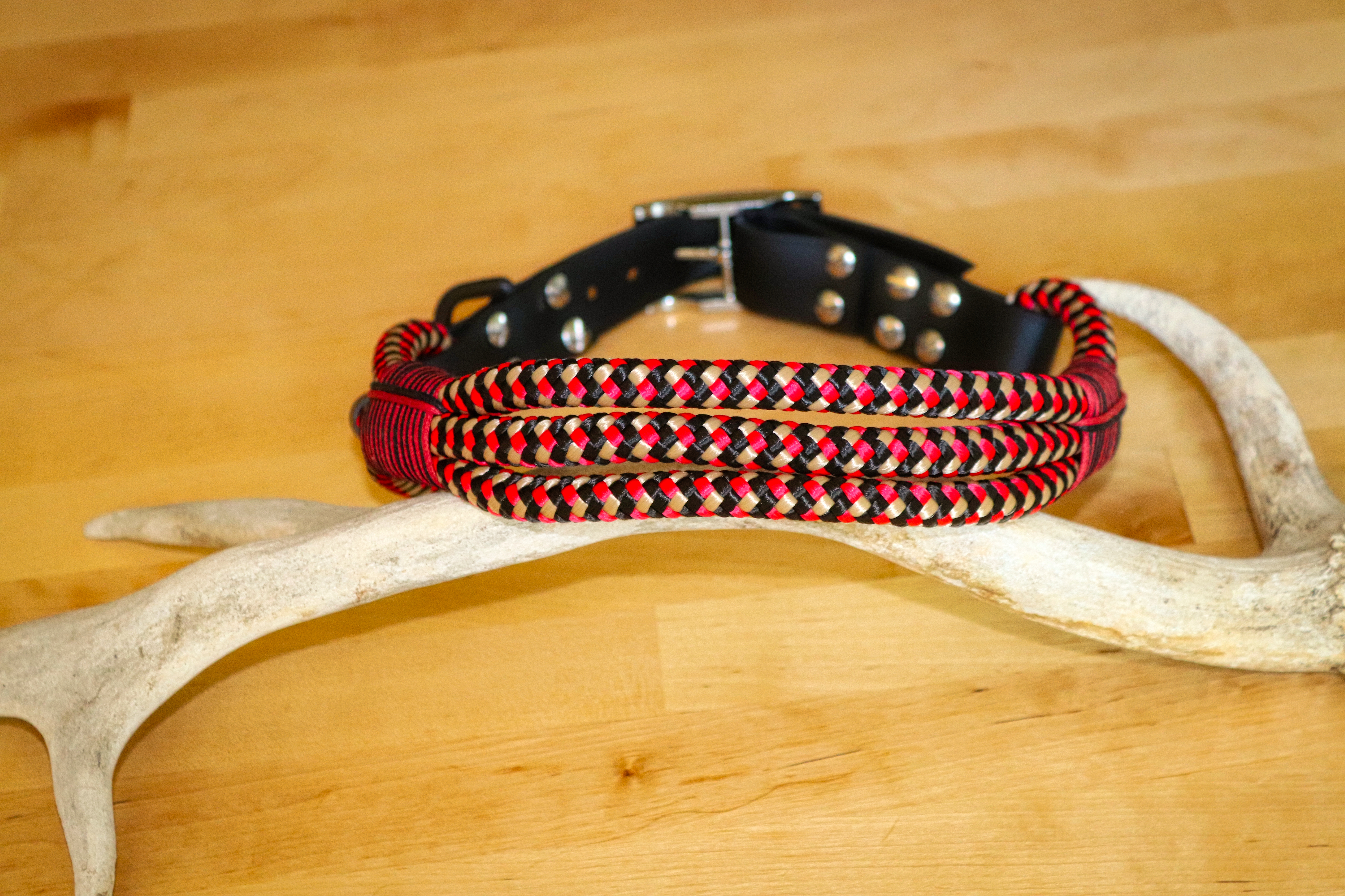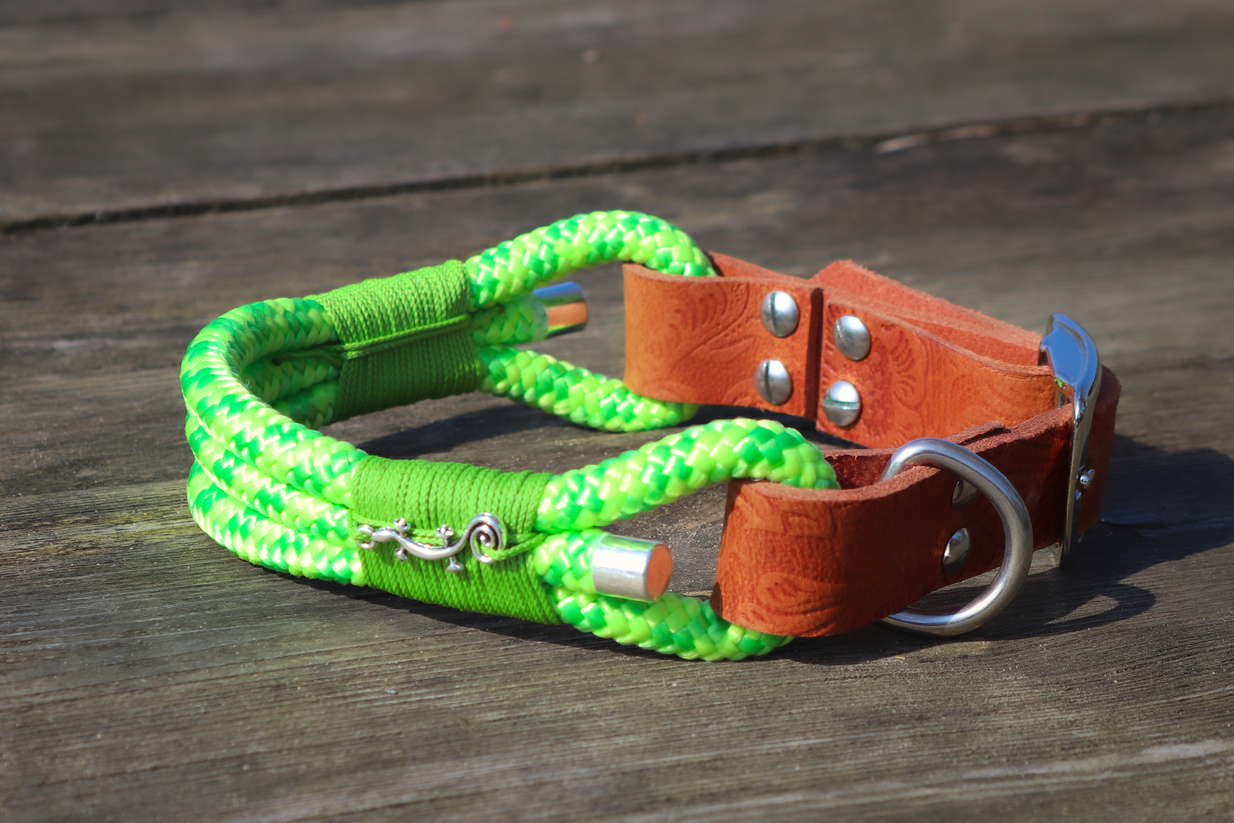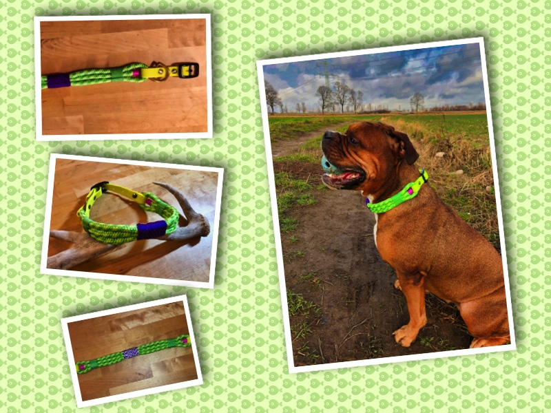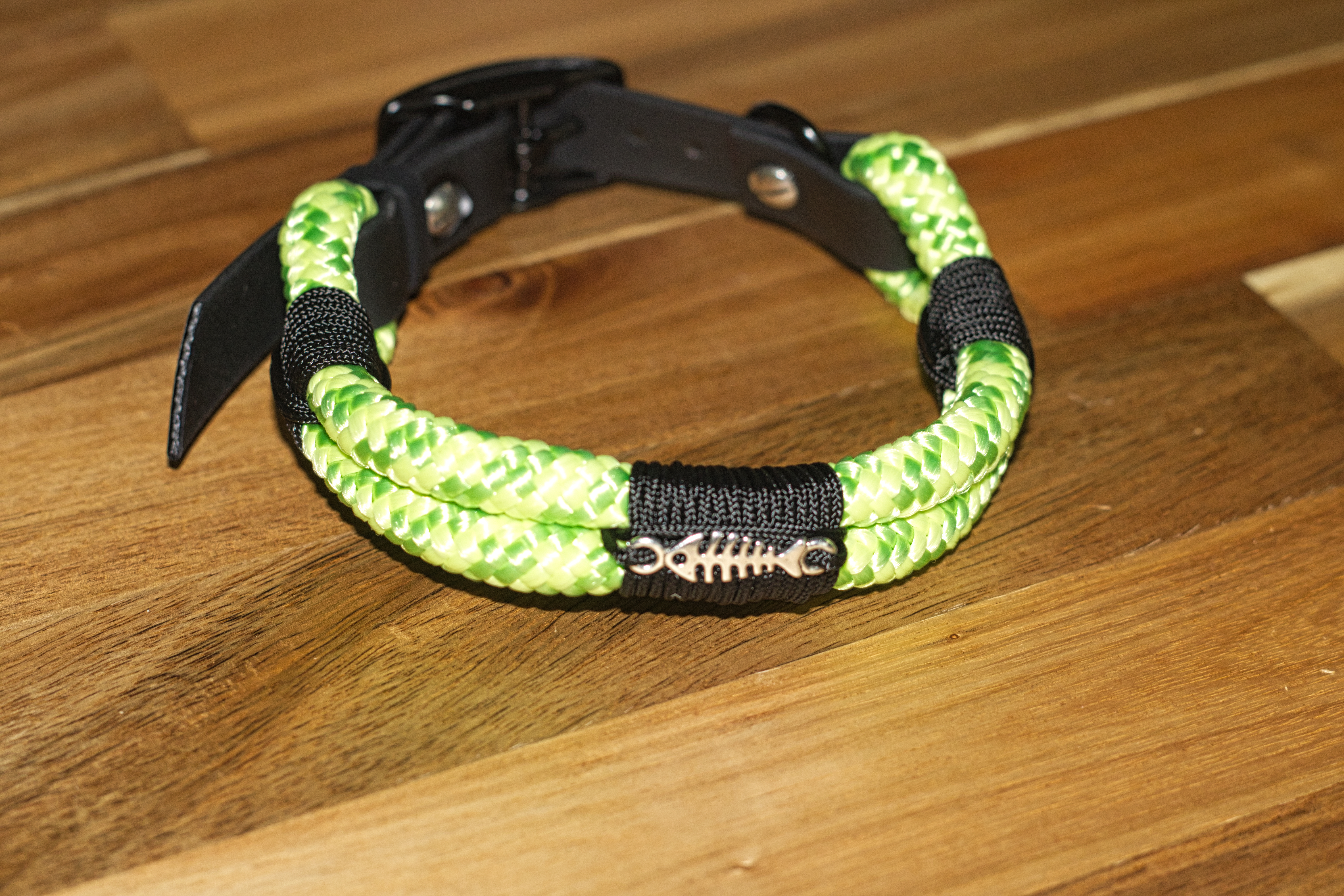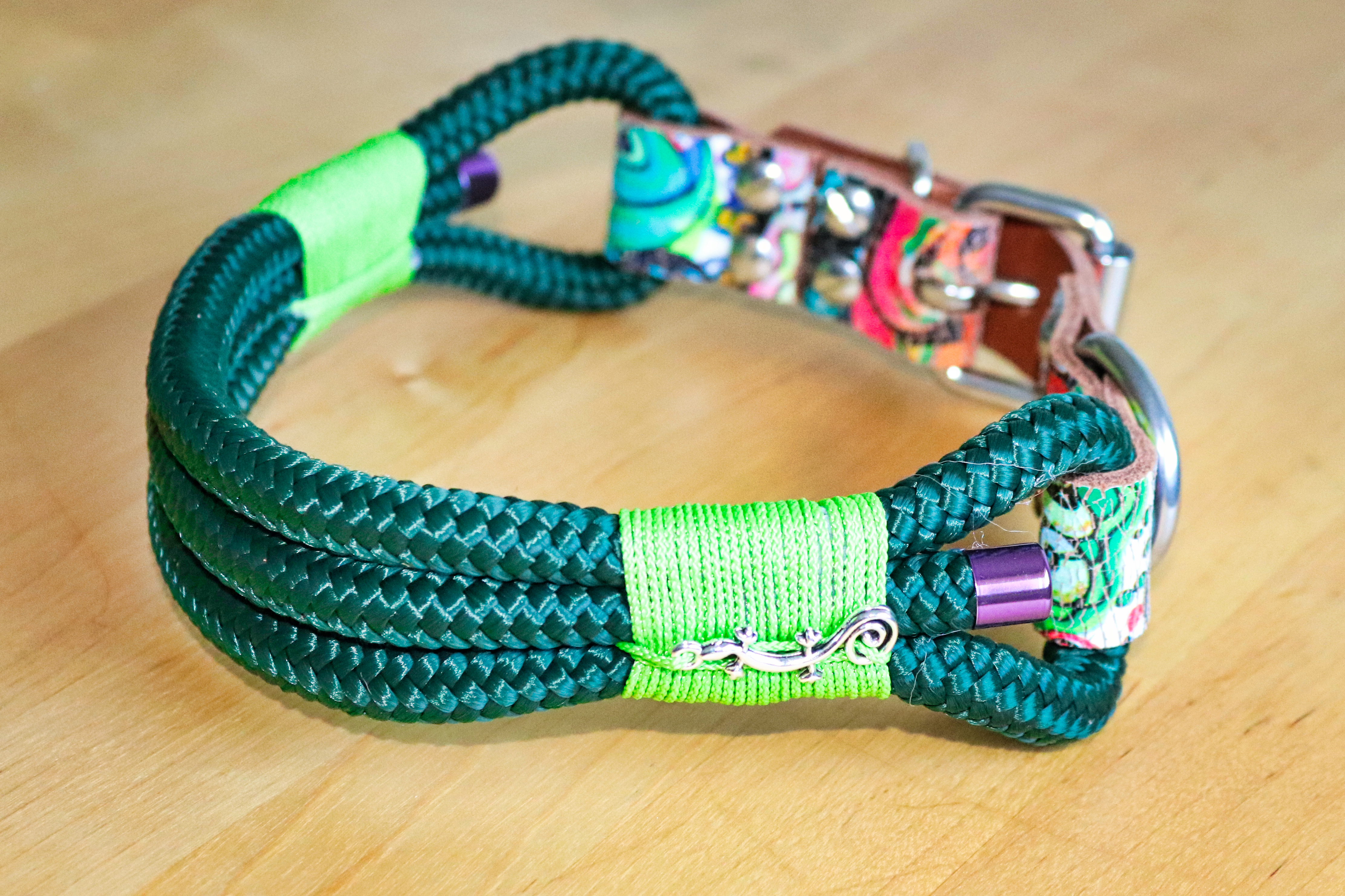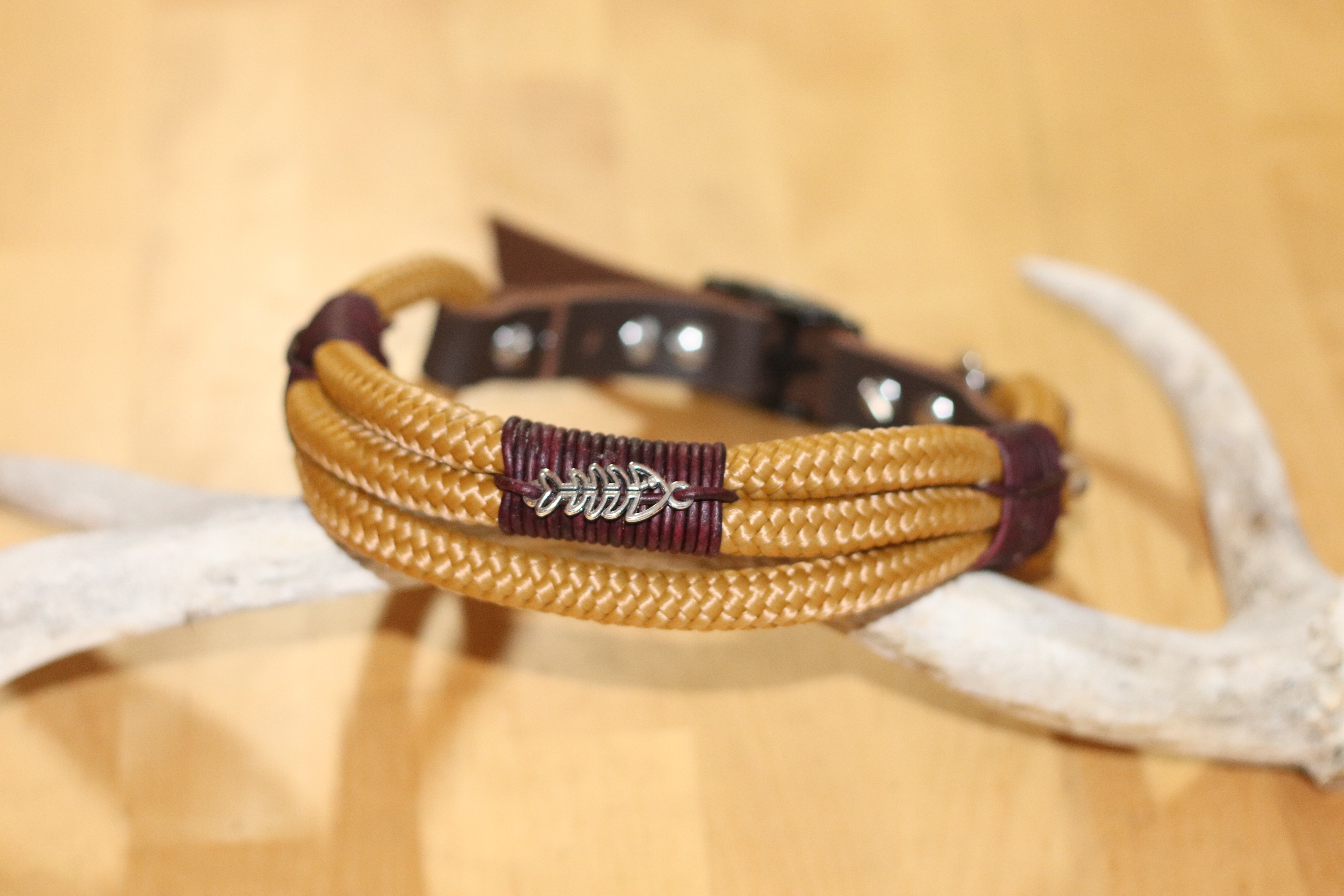 Zwei- oder dreireihige Halsbänder aus PPM Seil mit Leder- oder Biothane Verschluss. Eine kleine Auswahl.